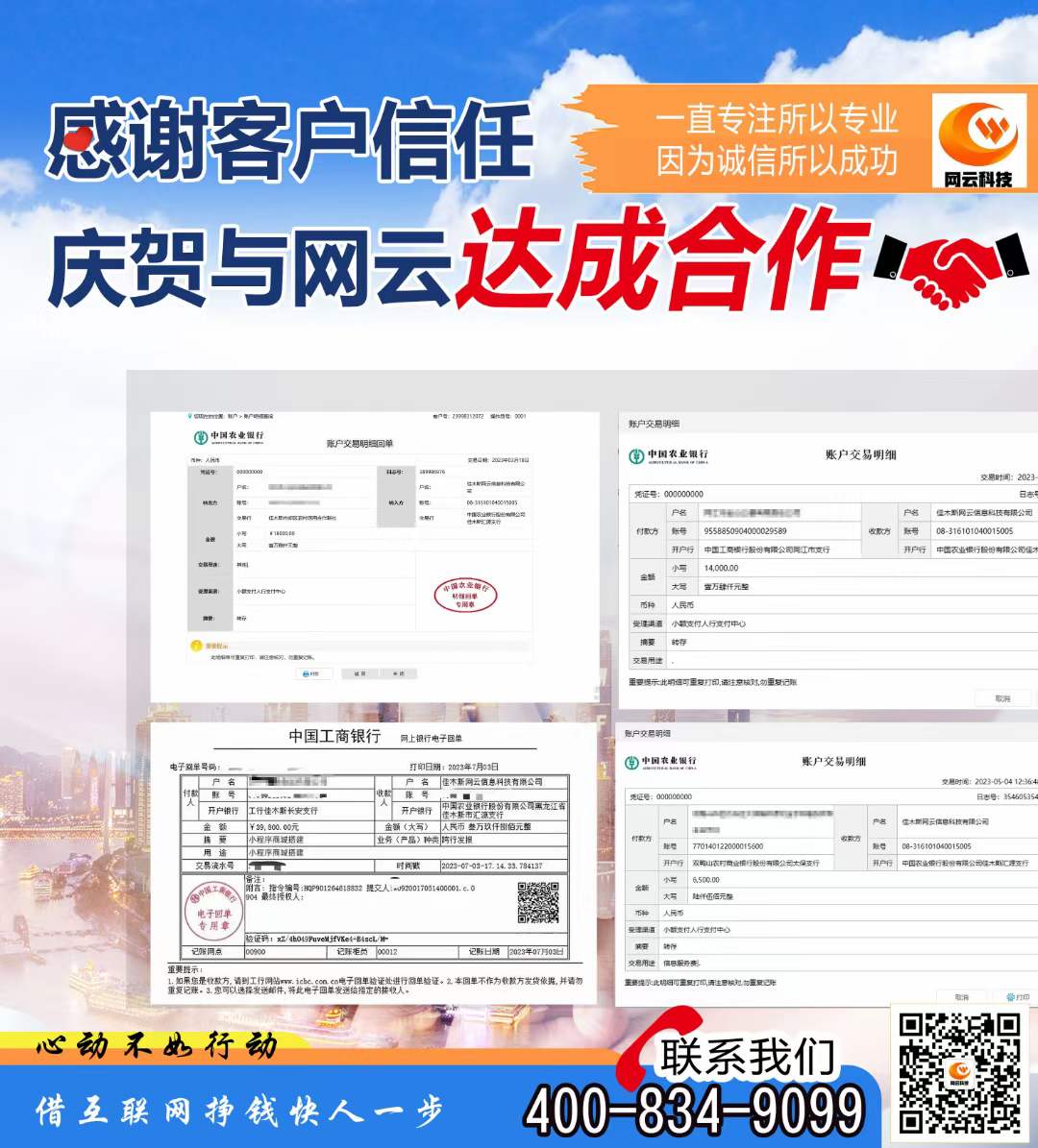 感謝客戶信任,慶賀與網(wǎng)云達(dá)成合作!!一直專注所以專業(yè),因?yàn)檎\信所以成功,選擇網(wǎng)云,選擇靠譜,心動不如行動,借互聯(lián)網(wǎng)掙錢快人一步。