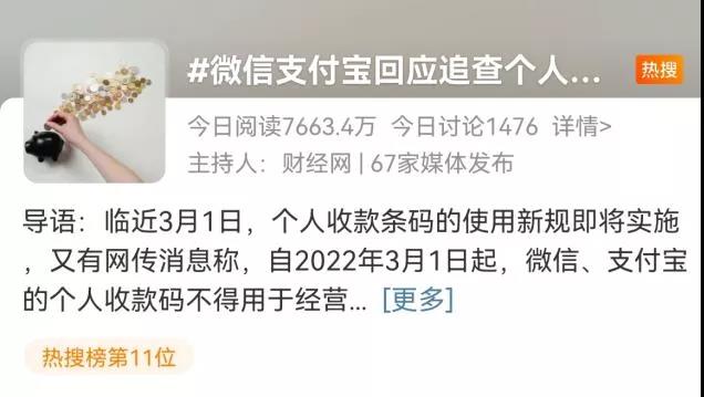 據(jù)媒體報(bào)道,近期有網(wǎng)傳消息稱,自2022年3月1日起,微信、支付寶的個(gè)人收款碼不得用于經(jīng)營(yíng)性收款。不僅如此,近4年的數(shù)據(jù)將被追查,一旦數(shù)額較大需按4.5%補(bǔ)稅,還要繳納滯納金和罰款。對(duì)此,微信和支付寶回應(yīng)稱,追查個(gè)人收款碼近4年數(shù)據(jù)的說(shuō)法為謠言。