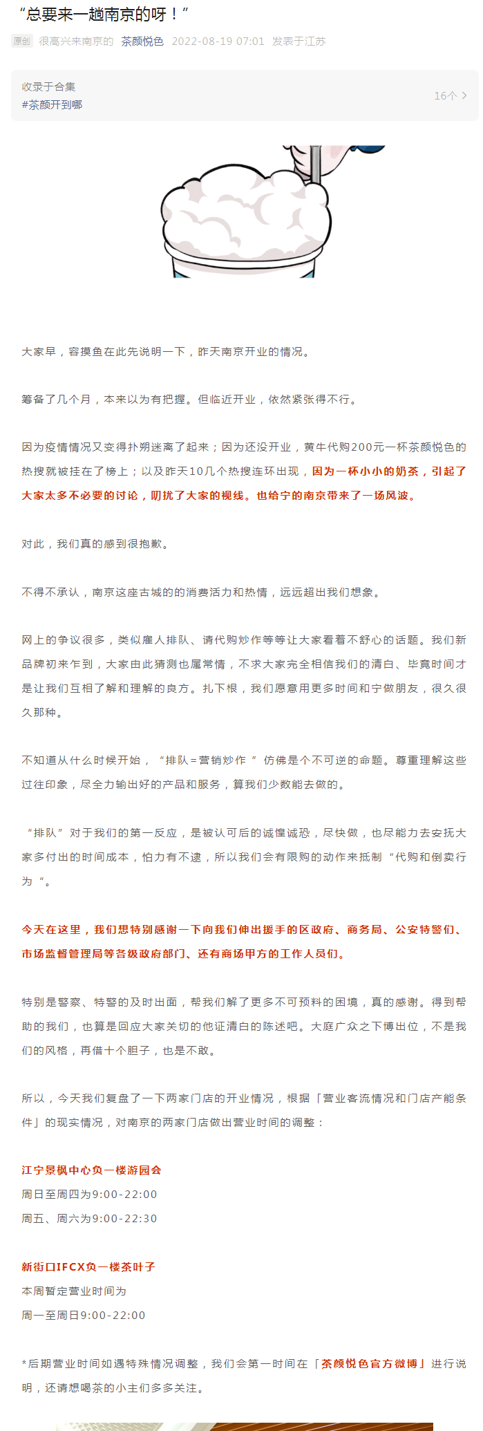 “因為一杯小小的奶茶,引起了大家太多的討論,叨擾了大家的視線。“對此,我們真的感到很抱歉。” 茶顏悅色表示,“排隊”對于我們的反應,是被認可后的誠惶誠恐,盡快做,也盡能力去安撫大家多付出的時間成本,怕力有不逮,所以我們會有限購的動作來抵制“代購和倒賣行為”。 同時,茶顏悅色將根據營業客流情況和門店產能條件的現實情況,對南京的兩家門店做出營業時間的調整。